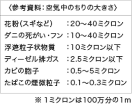 「汚染」ではありませんが、春先に花粉症に悩まされる「花粉アレルギー体質」の方にとって、スギやヒノキから飛散する花粉は大敵です。しかし、スギ花粉の粒子は直径約20~40ミクロンとSPMに比べて大きく、吸い込んでもくしゃみや鼻水、せきやタンとして体外に排出されます。